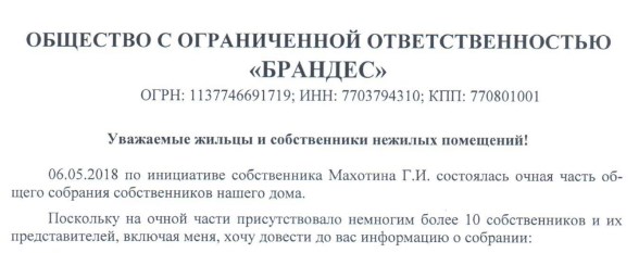 Информируем вас, Жилищной инспекцией установлено, что при проведении общего собрания собственников, оформленных протоколом № 1 от 24.12.2016 года, отсутствует достаточное количество голосов по вопросам изменения способа управления домом и создание ТСН.